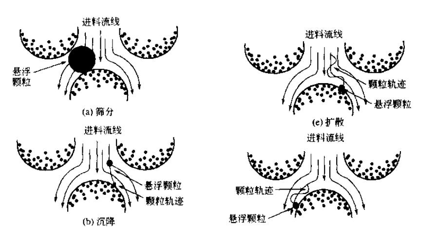 所有澄清過濾技術(shù)至少涉及一種下面所列出的機(jī)理篩分,沉降,截留,慣性碰撞,擴(kuò)散,流體動(dòng)力學(xué)相互作用,靜電相互作用,雙電層排斥作用,范德華力.