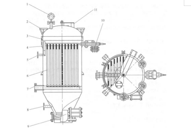 振動(dòng)排渣立式葉濾機(jī)由罐體,罐蓋,提升機(jī)構(gòu),振動(dòng)器,濾片,氣動(dòng)蝶閥,壓力表等組成.
