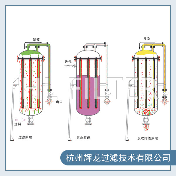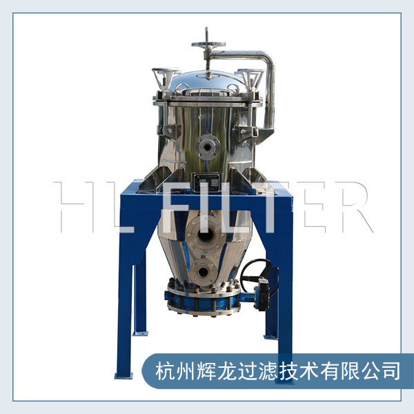 過濾機(jī)無需濾餅過濾,對(duì)細(xì)粘的料液,使得過濾速度一直處于很高的起始通量狀態(tài)在過濾過程中,一組過濾,一組反吹模式中,過濾機(jī)內(nèi)反吹下來的液渣快速進(jìn)入過濾機(jī)的圓錐底部,并在底部排出.