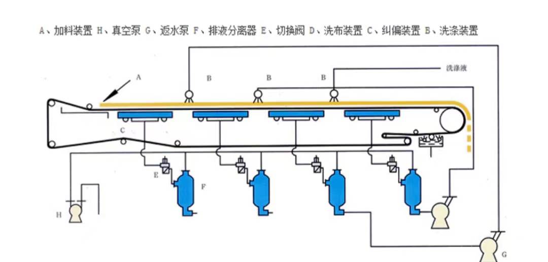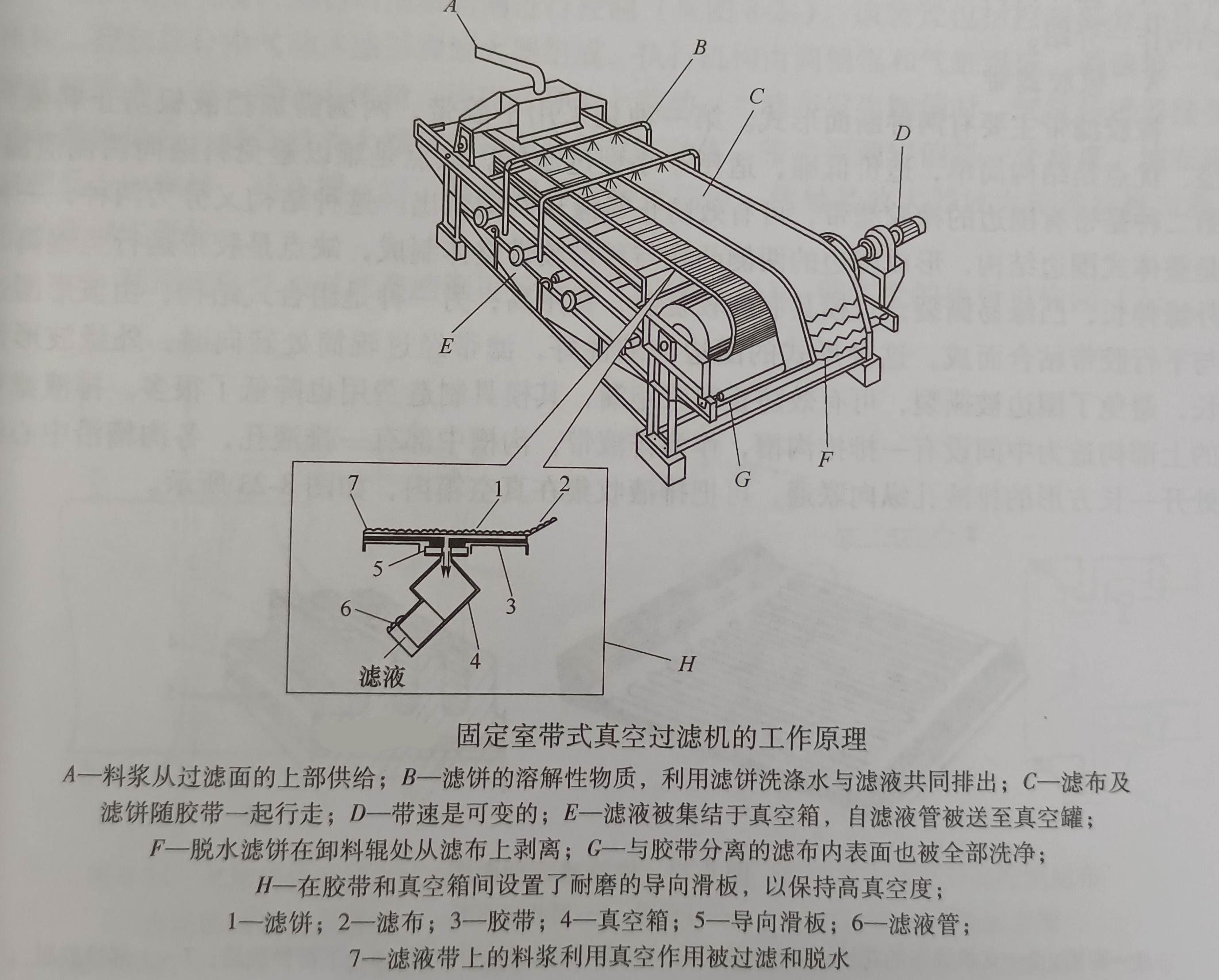 固定室?guī)秸婵者^(guò)濾機(jī)的工作原理首先料漿經(jīng)進(jìn)料裝置均勻分布到移動(dòng)的濾帶上.料漿在真空的作用下進(jìn)行過(guò)濾,抽濾后形成的濾餅向前行進(jìn)接受洗滌.