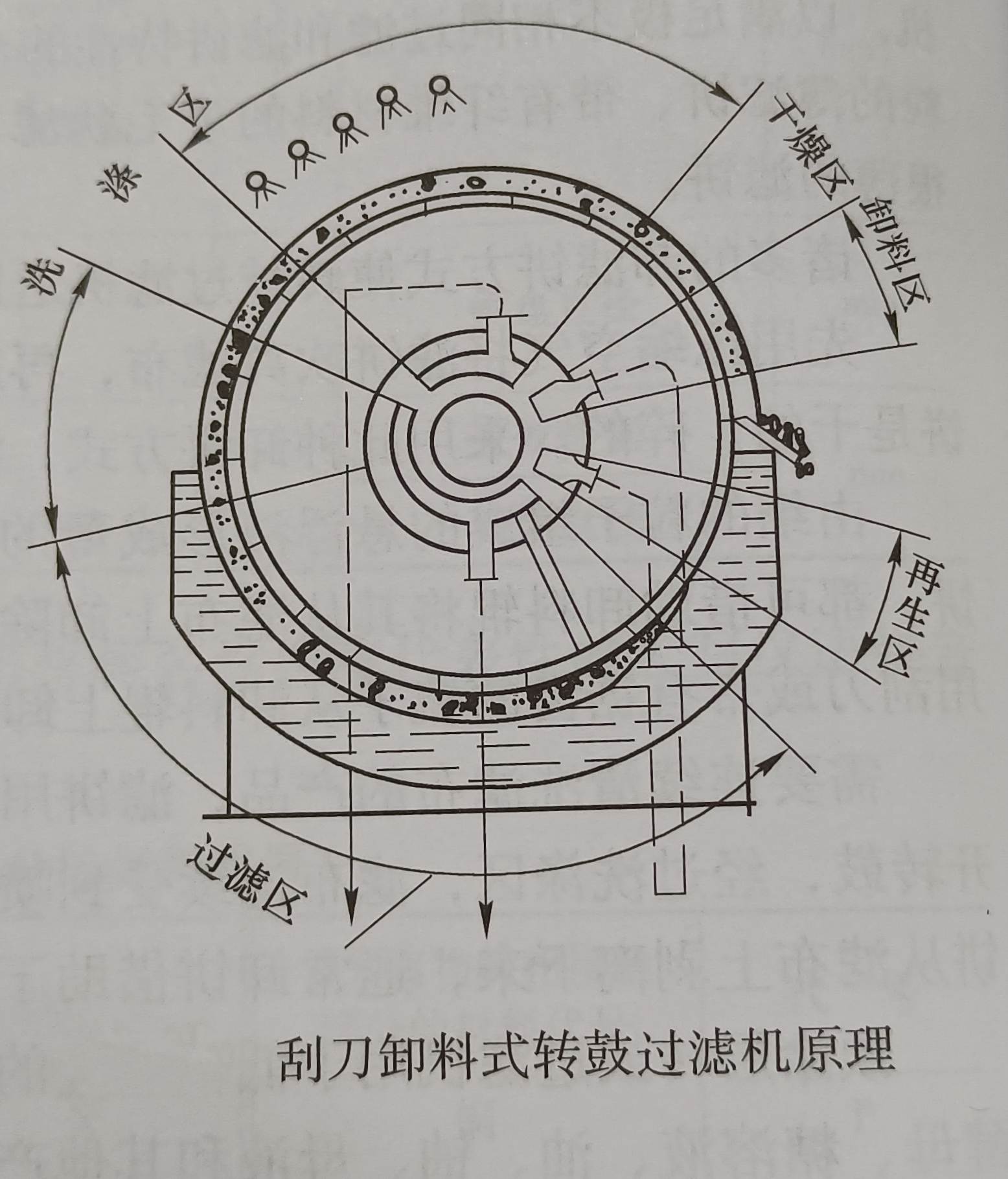 刮刀卸料式轉(zhuǎn)鼓真空過濾機(jī)的主要部件包括水平放置的轉(zhuǎn)鼓,料漿槽,攪拌器,分配頭也稱為,切換閥,轉(zhuǎn)皺的表面,圓周面,鑲有若干塊長方形的篩板,在篩板上順次鋪有金屬網(wǎng)和濾布.