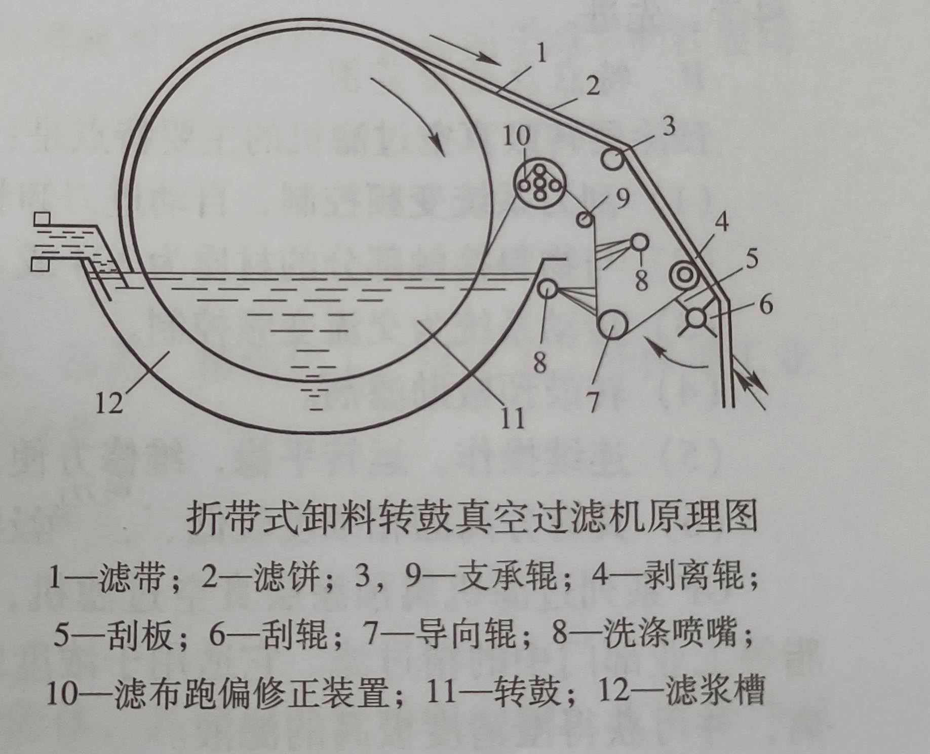 帶在轉(zhuǎn)鼓的帶動下一起循環(huán)轉(zhuǎn)動,因而在轉(zhuǎn)動過程中,有時和轉(zhuǎn)鼓接觸,有時則離開轉(zhuǎn)鼓面.濾帶由卸料輥及導(dǎo)向輥支承,并設(shè)有防止濾布跑偏的裝置.