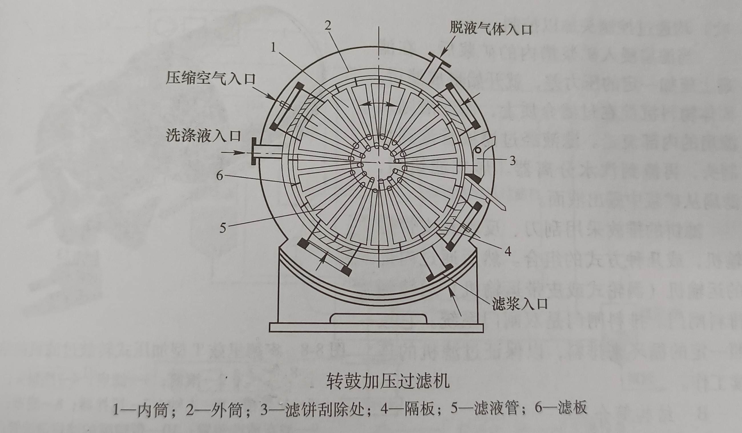 多室型加壓式轉(zhuǎn)鼓過濾機(jī)具有雙層圓筒,即固定不動的外簡和連續(xù)旋轉(zhuǎn)的內(nèi)筒,內(nèi)外筒之間形成的空間由隔板分隔為過濾,洗滌,干燥,卸料及濾布洗滌等區(qū)間.改變隔板位置可改變各區(qū)間所占比率.