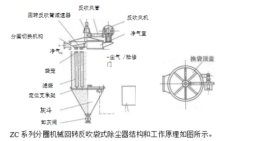 回轉(zhuǎn)噴吹脈沖袋式除塵器由灰斗,中箱體(塵氣室),上箱體(凈氣室)以及噴吹清灰裝置組成.